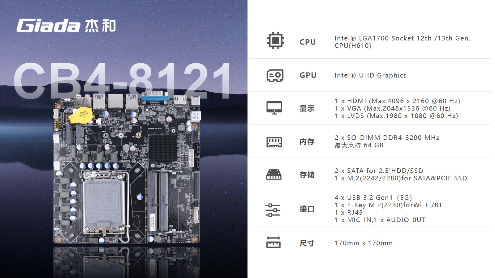 CB4-8121采用Intel Alder Lake-S平台H610芯片组,该平台支持全新第13/12代Core i7/i5/i3处理器,16核24线程,IPC相比上一代提升19%。与第10代酷睿相比,单线程性能提升高达 1.36 倍,多线程性能提升高达 1.35 倍。