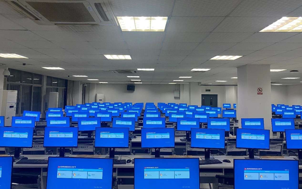 在某大学实训室,整齐的电脑屏后面是统一的星空电竞科技云终端主机,老师在讲台上通过电脑端的管理软件,轻松地将教学资料推送到学生的终端上,每位学生的电脑屏幕一致会出现同个页面。