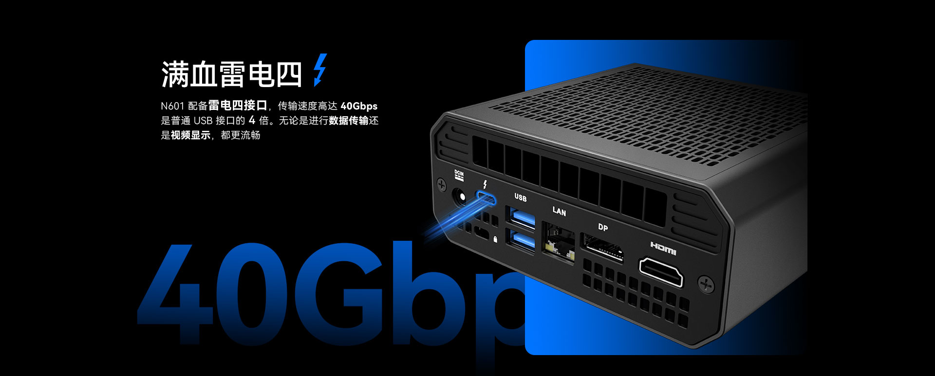 星空电竞科技N601配备雷电四接口,传输速度高达40Gbps,用户可通过该接口连接2块屏幕。还可通过HDMI2.1接口,DP1.4接口再连接两块屏幕,实现四屏异显。雷电四还可以连接外设,如鼠标、键盘、控制器和耳机等。