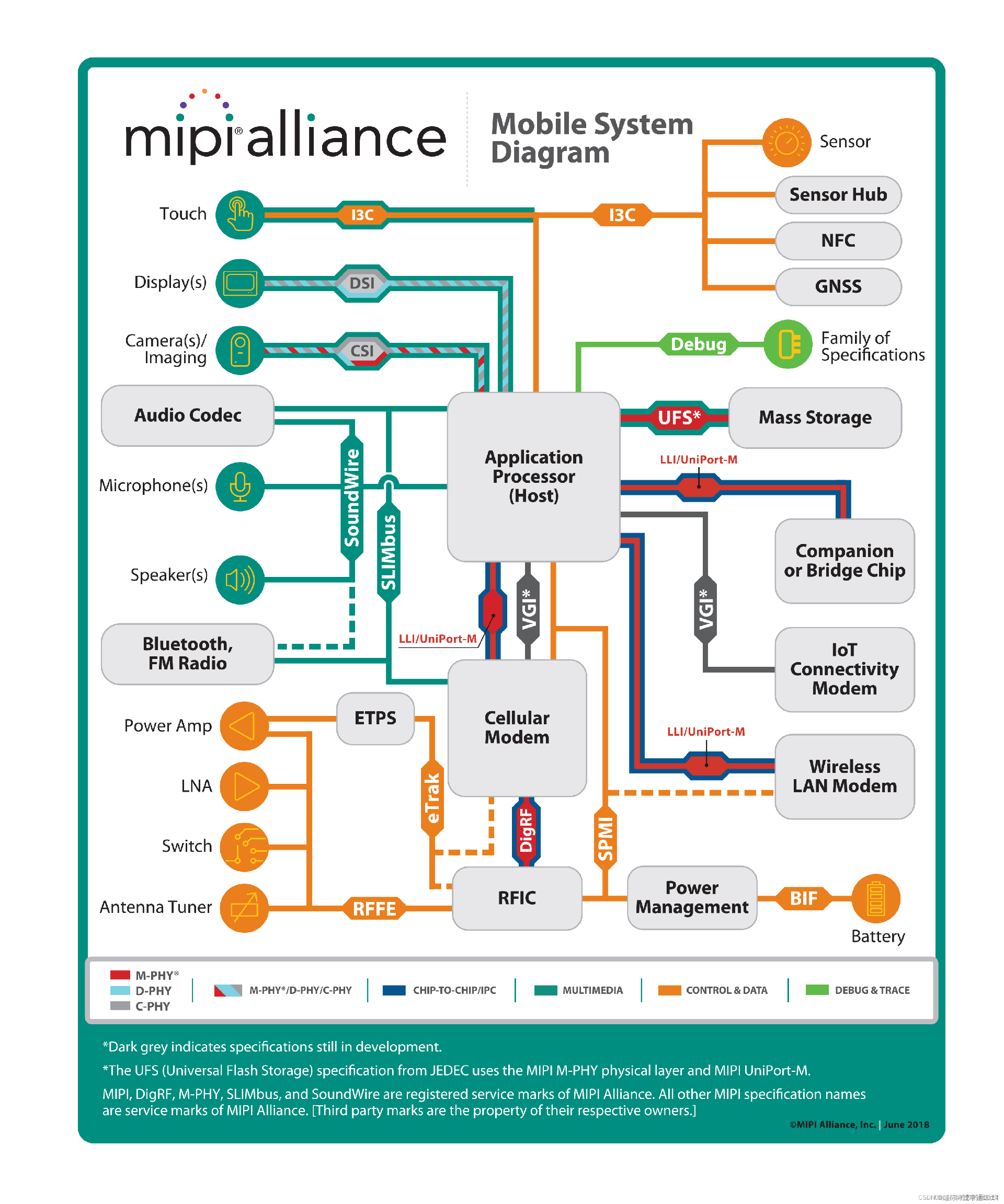 MIPI,全称为:Mobile Industry Processor Interface,由MIPI联盟开发,是一种高性能、低功耗、低成本的串行通信接口,目的是把设备内部的接口如摄像头、显示屏接口、射频/基带接口等标准化,从而减少设备设计的复杂程度和增加设计灵活性。统一接口标准的好处是厂商可根据需要灵活选择不同的芯片和模组,更改设计和功能非常快捷方便,MIPI主要用于移动设备和嵌入式设备中,比如手机、电脑、车载娱乐系统、可穿戴设备及物联网(IoT)设备等。