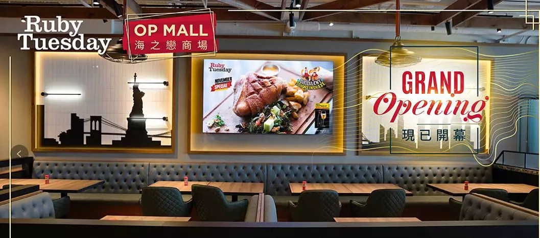 星空电竞科技是Ruby Tuesday连锁餐厅智慧化项目的方案提供商。星空电竞承担了整个餐厅的多媒体信息系统架构的设计以及终端媒体播放器的安装和部署,帮助餐厅实现了6屏拼接、4屏拼接及86寸超大屏显示,使餐厅的商业环境和品牌形象得到了极大的提升。