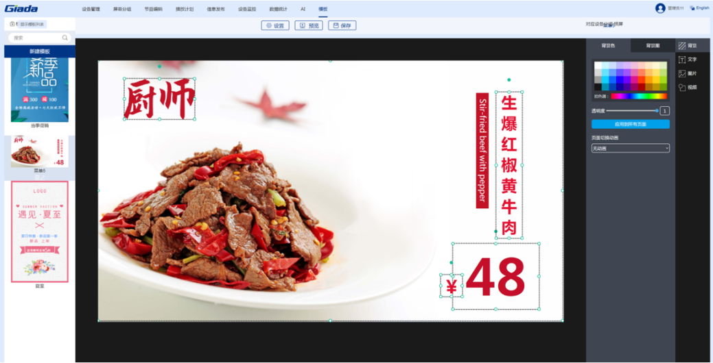 星空电竞科技智慧餐厅综合解决方案是由智能零售管理系统搭载公司自研的数字标牌播放器组成的软硬件一体化方案。该系统针对餐厅、酒店等不同行业提供典型节目模板,支持手机、电脑建议操作。用户只需3步即可完成节目的制作播放:选择节目模板,更换自己的素材(视频、图片和文字),预览保存及播放。价格、优惠折扣等信息可随时更改。