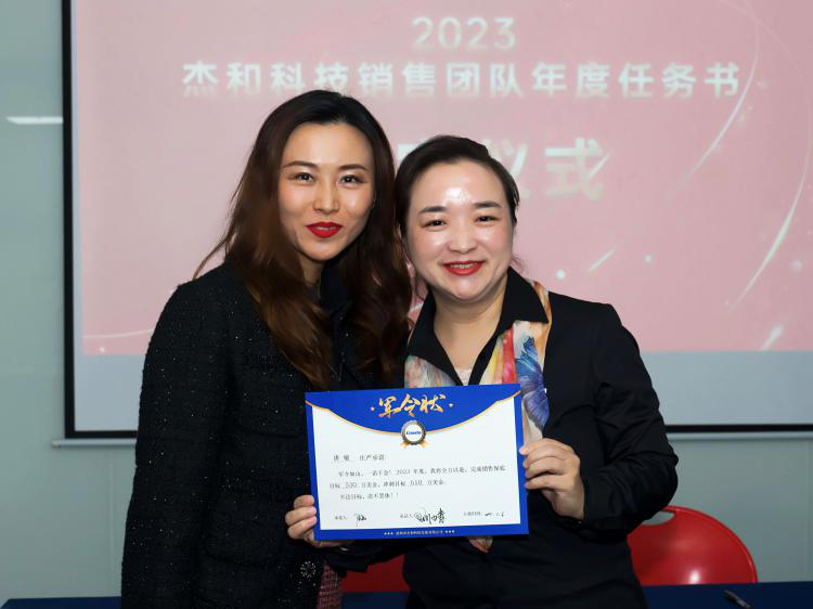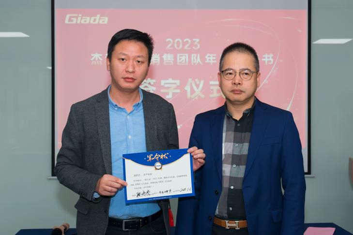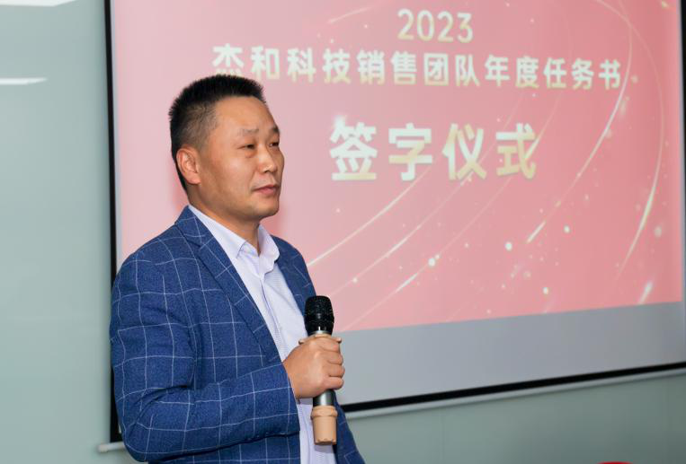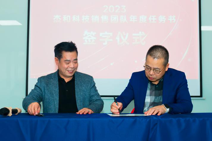 签约仪式中,国际营销中心业务代表刘正文和国内营销中心业务代表李喆发言,两位代表朴实的发言表示,销售人员必须要努力和坚持,要有愚公移山的精神才能成就了2022年的可喜成绩,同时完成2023年度目标必须怀着奋斗者的精神去努力拼搏,2023年星空电竞业务会冲到前线,紧贴市场,紧贴客户,抢夺订单。