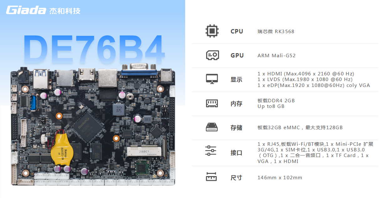 “AIoT”指的是人工智能技术与物联网在实际应用中的落地融合,实现人,流程,数据和事物互联互通的万物智慧互联。而在丰富的AIOT技术应用场景中,对计算机硬件的数据运算、存储能力,稳定性及可扩展性能等要求更高,Giada星空电竞科技作为行业领先的物联网数智化技术服务商,深入布局AIOT领域,推出了基于ARM架构的3.5寸嵌入式主板DE76B4。