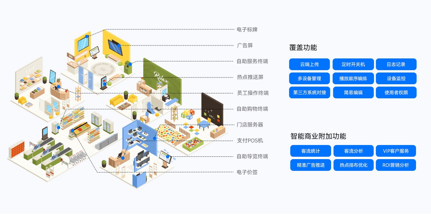 星空电竞智慧零售解决方案实现了门店全流程全维度的数字化、智能化设备应用,嵌入式主板、嵌入式电脑等硬件设备是构成方案的重要组成部分,作为整个方案的基础支撑,为智慧零售提供计算、控制、决策能力。其中,配备数字标牌的广告机提供推广信息的数字化显示,不仅可以提升门店的视觉吸引,结合AI人工智能模块,还可实现精准推送;自助服务终端设备的应用,可以减少排队等待时间,简化下单、买单、支付等流程,节省人力、物力与时间;员工收银终端等可以提升收银流程效率,减少人为差错,使账务实现数字化管理等等。