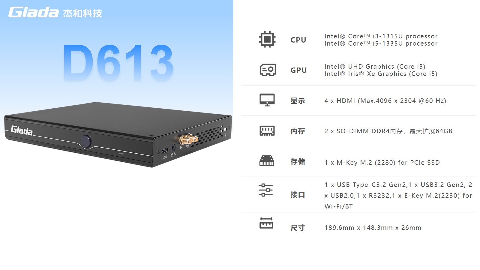 星空电竞数字标牌D613搭载Intel RaptorLake Corei3-1315U/i5-1335U处理器,可以同时连接4个4K显示器,支持4K分辨率编码解码,还支持5G蜂窝网络,速度比4G LTE快10倍。