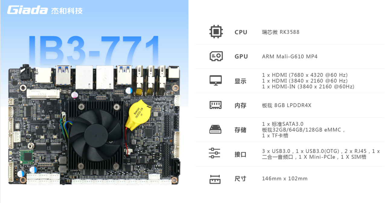星空电竞主板IB3-771搭载瑞芯微RK3588八核64位处理器,内置6TOPS算力的NPU,具备高算力、内存大、超强多媒体、多重扩展等技术优势。满足8k超高清视频的显示需求,还支持主流深度学习框架,为各类 AIOT 应用场景提供更优的性能表现,支持机器人、边缘计算、智能NVR、智能汽车、智慧大屏、AR/VR、智能自助终端场景的广泛应用。