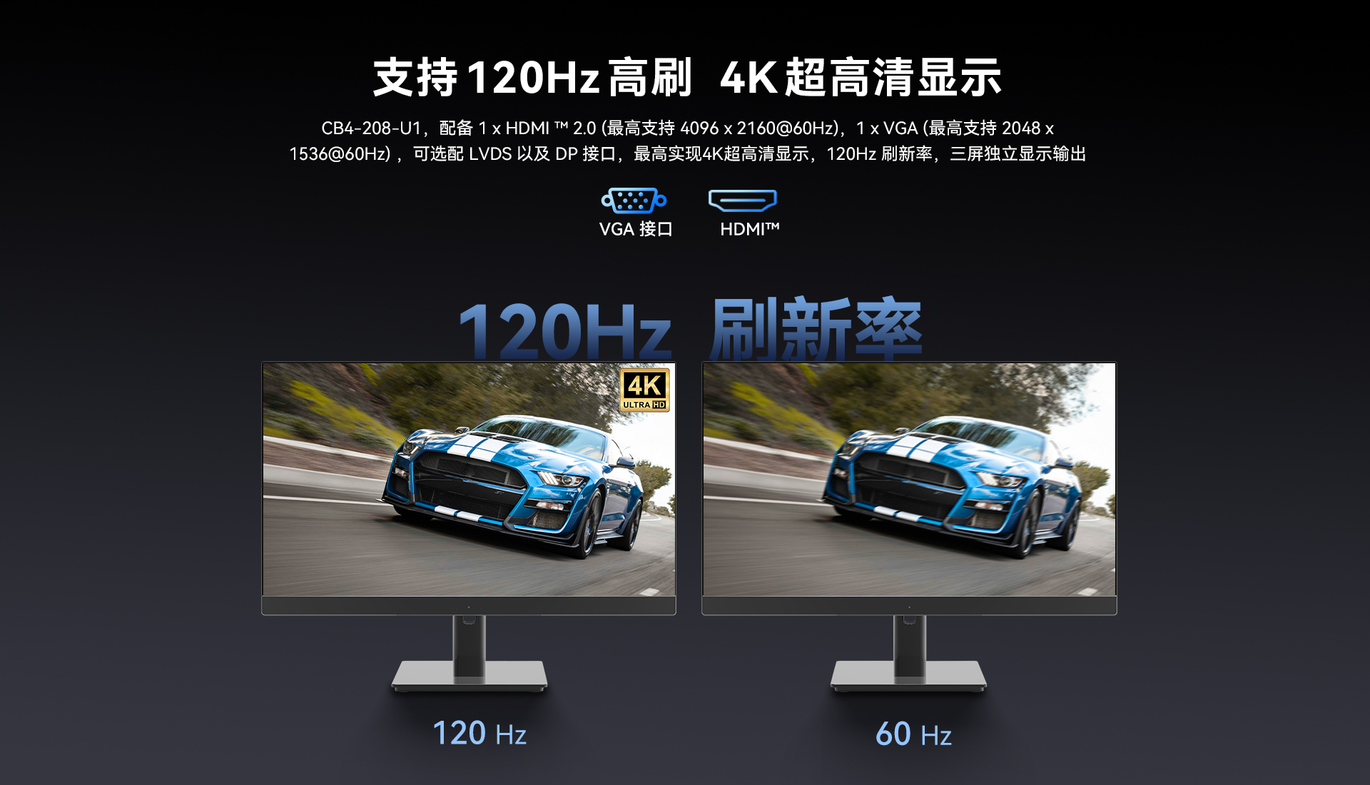 外部I/O | 接口 | 4xUSB3.2Gen1(5G) 1xVGA(Max.2048x1536@60Hz) 1xHDMI™2.0(Max.4096x2160@60Hz) 1xLVDS(双通道24Bit Max1920*1080@60Hz/100Hz/120Hz) 1xDP(Max.4096x2160@60Hz) 1xMIC-IN,1xAUDIO-OUT 1xRJ45 1xRS232(COM/VGA二选一) |